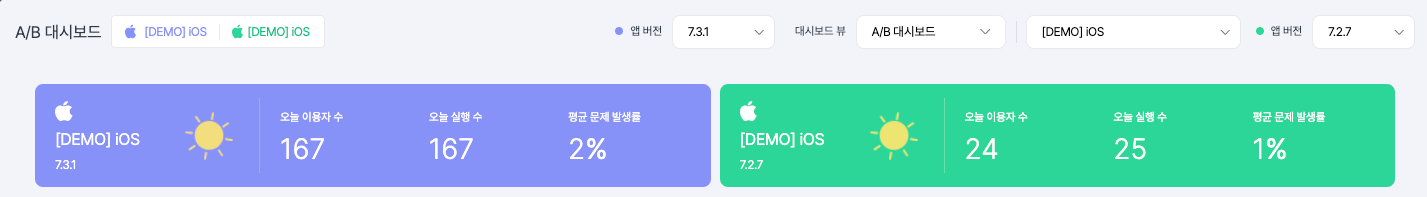 IMQA MPM A/Bのダッシュボードは、現在位置するプロジェクトAと他のプロジェクトBを比較し、一目で確認できるA/B専用指標で構成され、Android＋iOSのアプリ単位の統合モニタリングや、比較するプロジェクト2つを同時にモニタリングできます。