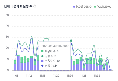 最近30分間のユーザー数、アプリの実行数を1分ごとに確認して比較することができます。「現在の利用者数&実行数」は1分毎に更新されます。