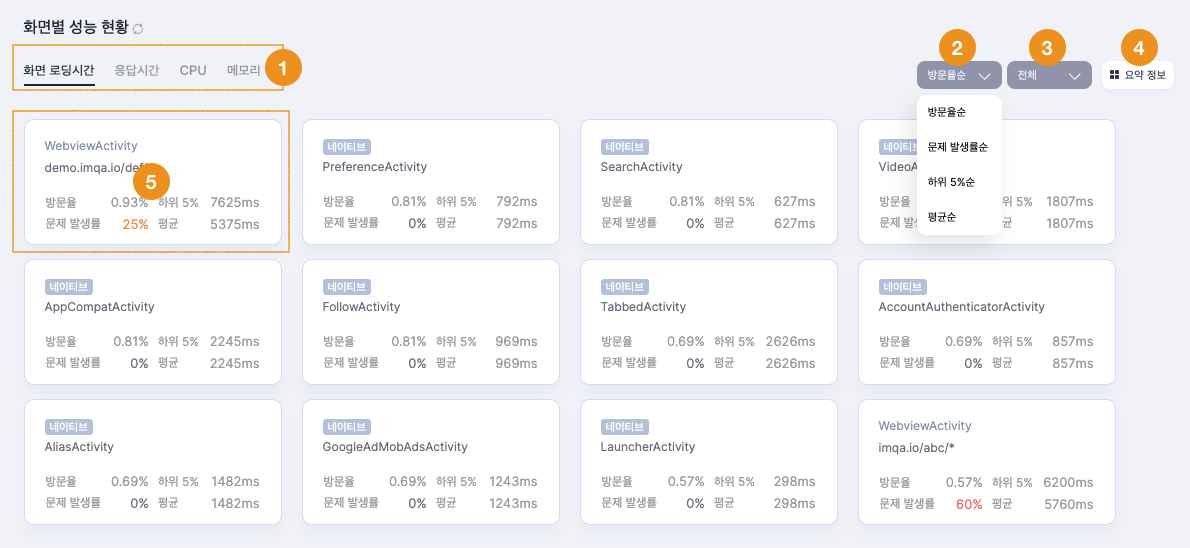 ❷ 画面カード整列 デフォルトの「訪問率順」に設定されており、「訪問率順」、「問題発生率順」、「下位5%順」、「平均順」でソートできます。 数値が高い順にソートされます。