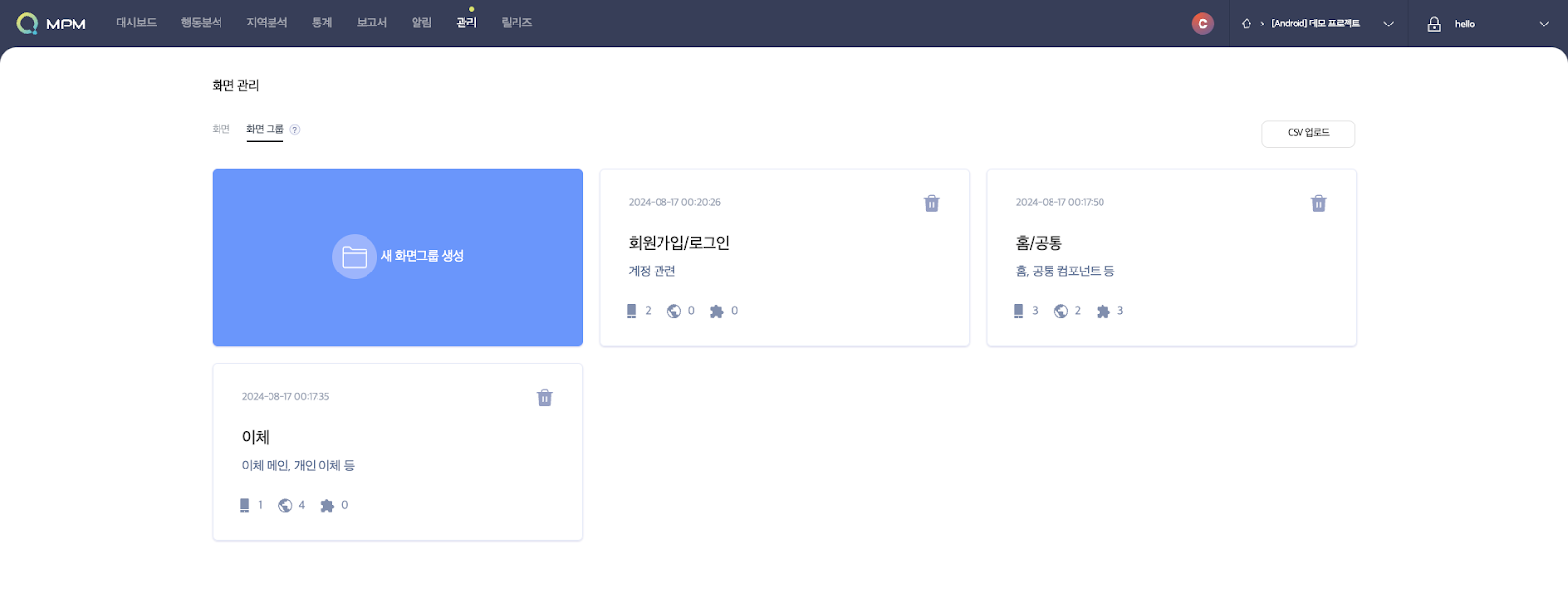 CSV 업로드를 통해 화면을 일괄 관리하는 경우, 아래의 내용을 참고해 주세요.