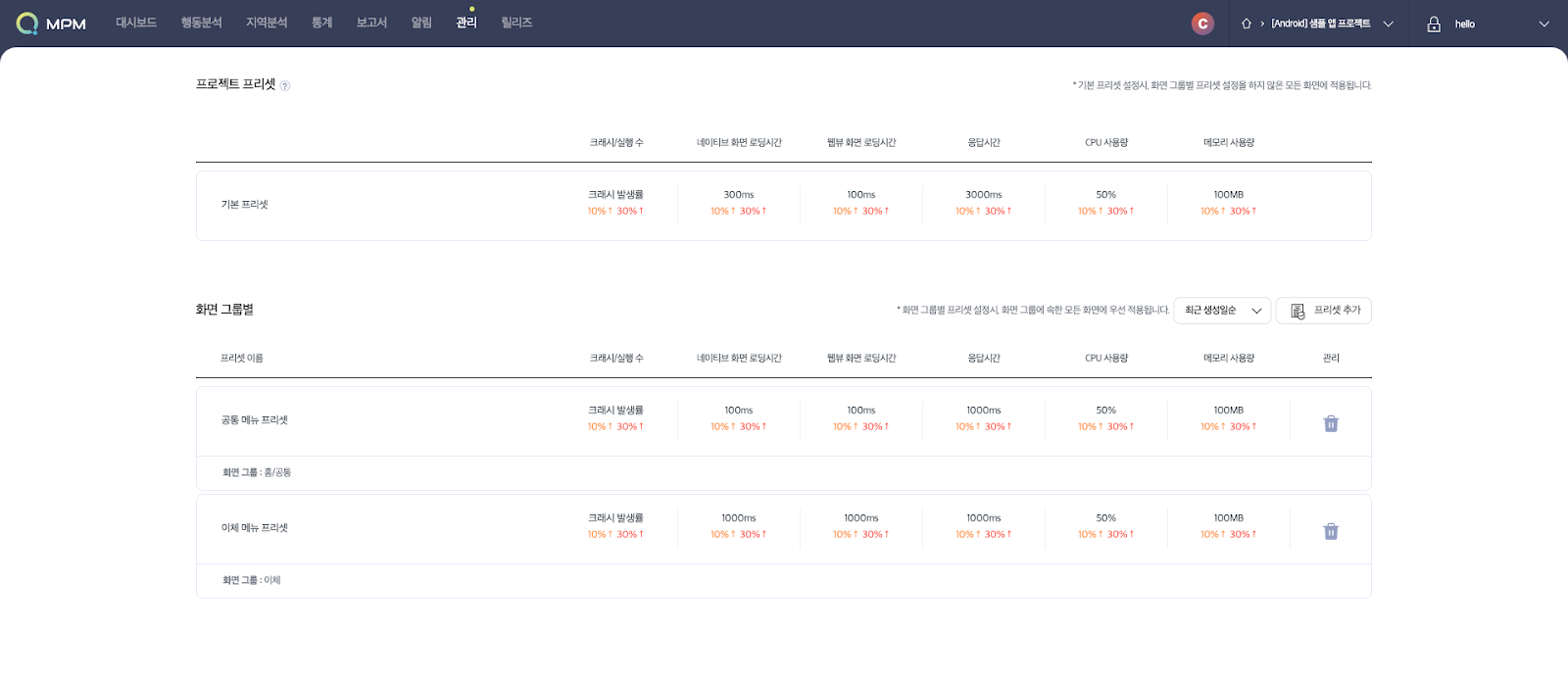 현재 화**면 그룹별 프리셋**은 서비스 내 성능 평가 기준으로 **사용되지 않습니다**. 추후 화면 그룹별 프리셋을 사용한 화면 그룹별 성능 분석 기능이 제공될 예정입니다.