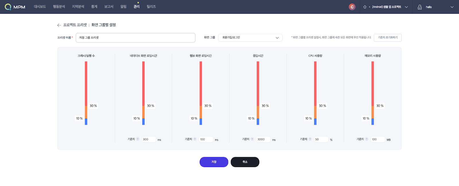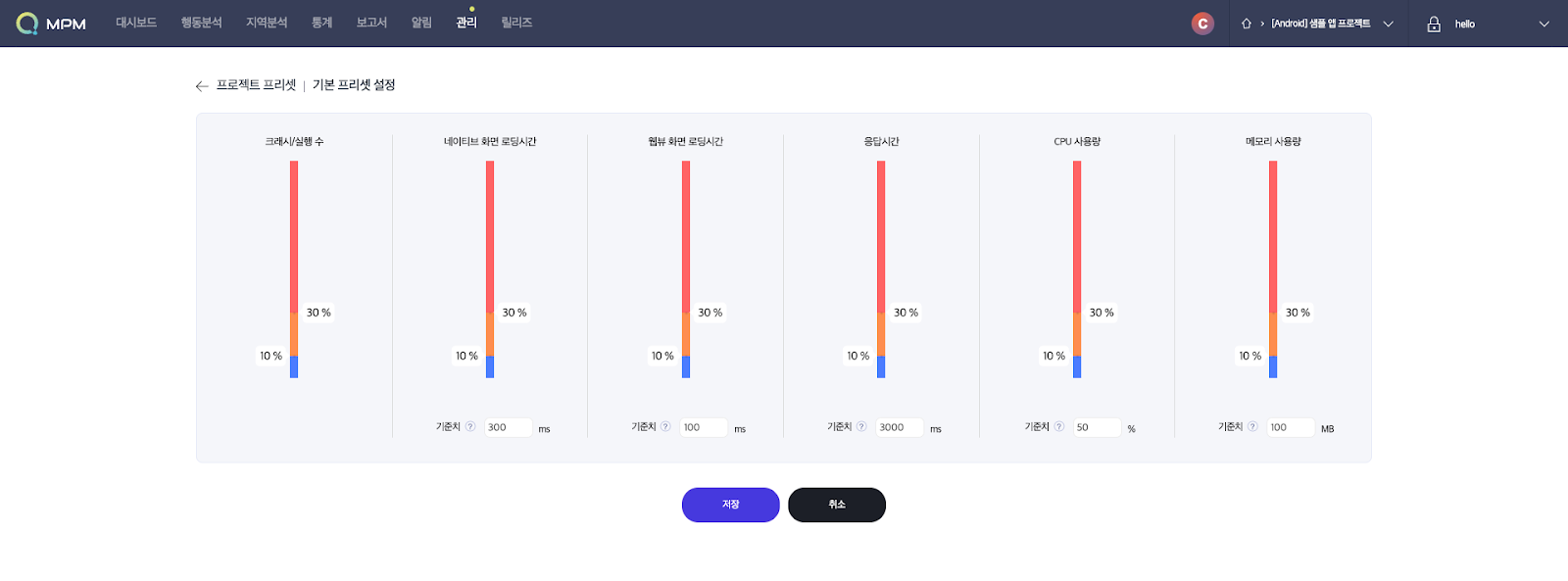 ‘크래시/실행 수’, ‘네이티브 화면 로딩시간’, ‘웹뷰 화면 로딩시간', ‘응답시간’, ‘CPU 사용량’, ‘메모리 사용량’에 대한 기준치와 비율을 설정할 수 있습니다. 변경 후 \[저장]을 클릭하여 적용합니다.